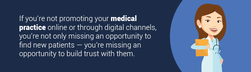 If you’re not promoting your medical practice online or through digital channels, you’re not only missing an opportunity to find new patients — you’re missing an opportunity to build trust with them.