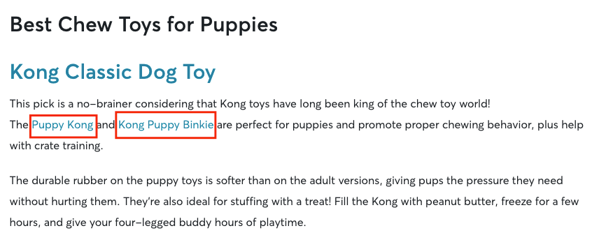 Let’s say you wrote a blog post about the best toys for teething puppies. You have a product called the Super Chewer that’s great for teething puppies. To link to it, you may write something like: