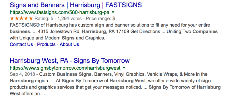 As you conduct keyword research, focus on long-tail keywords. These are keywords that contain three or more words. An example of a long-tail keyword is “sign companies in Harrisburg, PA.”