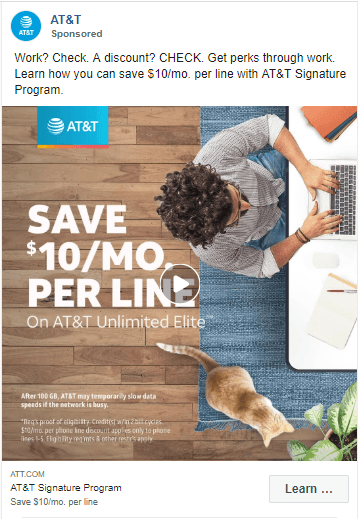 As for video ads, you’ll want to hook viewers in and make it enjoyable, so they’ll want to keep watching the ad. In this ad from AT&T, they peak their audience’s interest by using a cat in their ad.