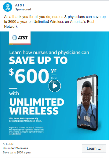 If you’re creating a photo ad, make sure that the photo pops off the page. You can make your photo stand out by having bright colors or interesting visuals that catch your audience’s attention. In this example from AT&T, you can see that their blue background pops off the page.