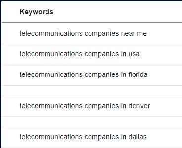 So, for example, if you type in the keyword “telecommunications companies” in a keyword research tool, you’ll generate a list of relevant keywords related to that term.